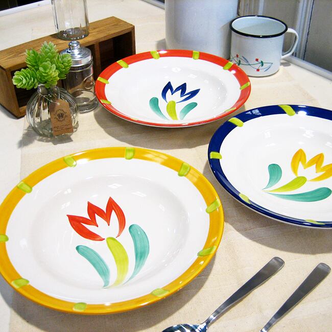 ハンガリーの陶磁器メーカー、ヘレンド・マジョリカ(HERENDI MAJOLIKA)のカラフルなチューリップがハンドペイントされたラウンドのデザートプレートです。直径約21cmと大きめのサイズなので、大きいパンケーキやフルーツの盛り合わせなどにもお使いいただけます。