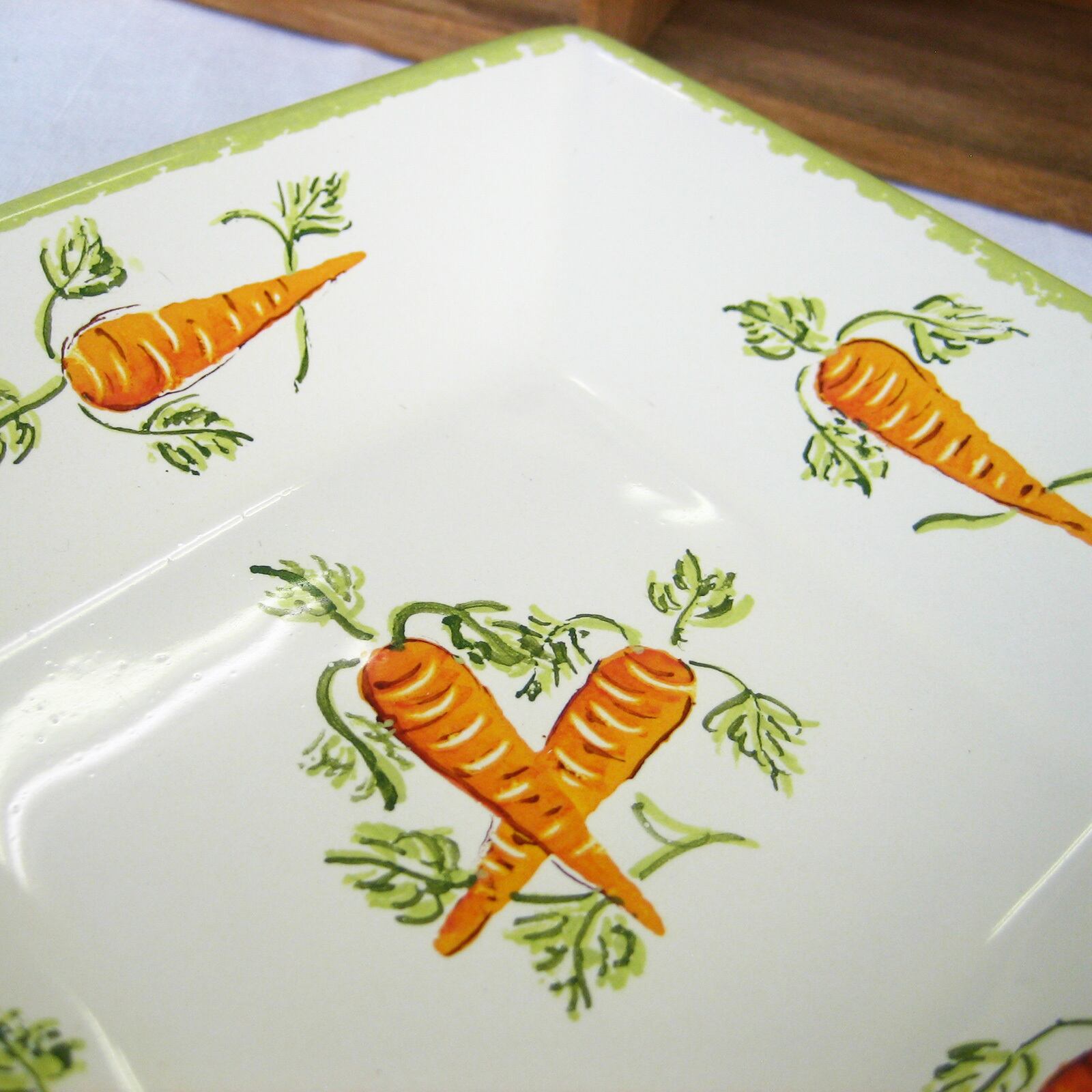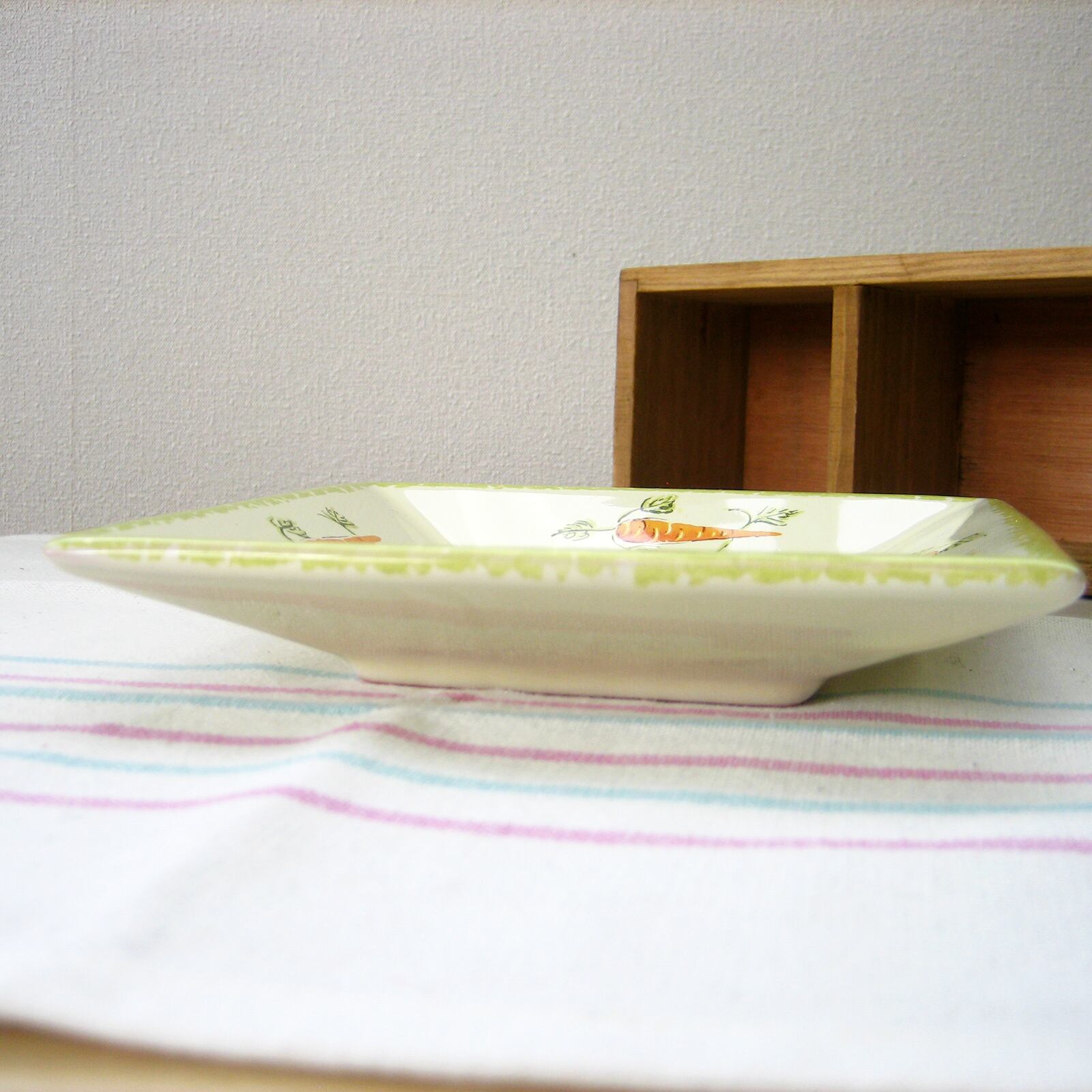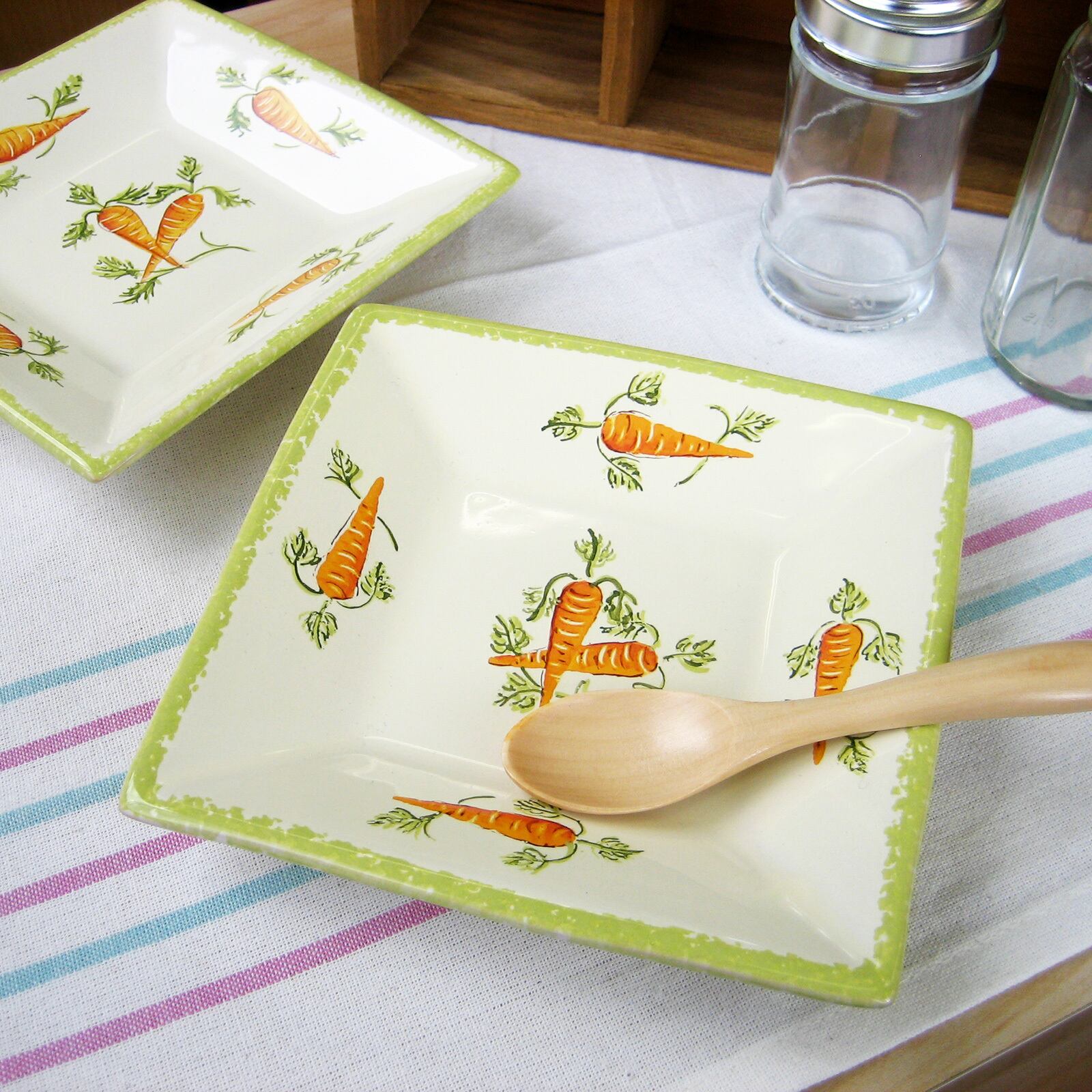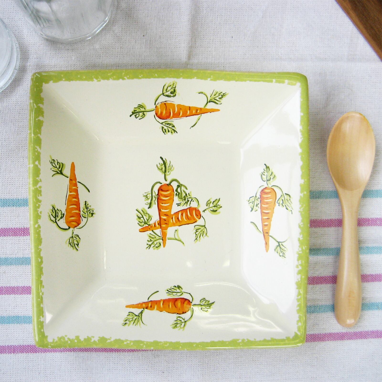ハンガリーの陶磁器メーカー、パタキ・ケラーミア(PATAKI KERÁMIA)の素朴でほっこり感のあるにんじんイラストのスクエアプレートです。丁寧にハンドペイントされたにんじんが描かれていて、カントリー調のようなどこか懐かしくて温かみのある印象のお皿です。