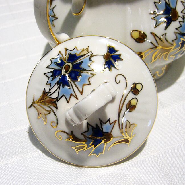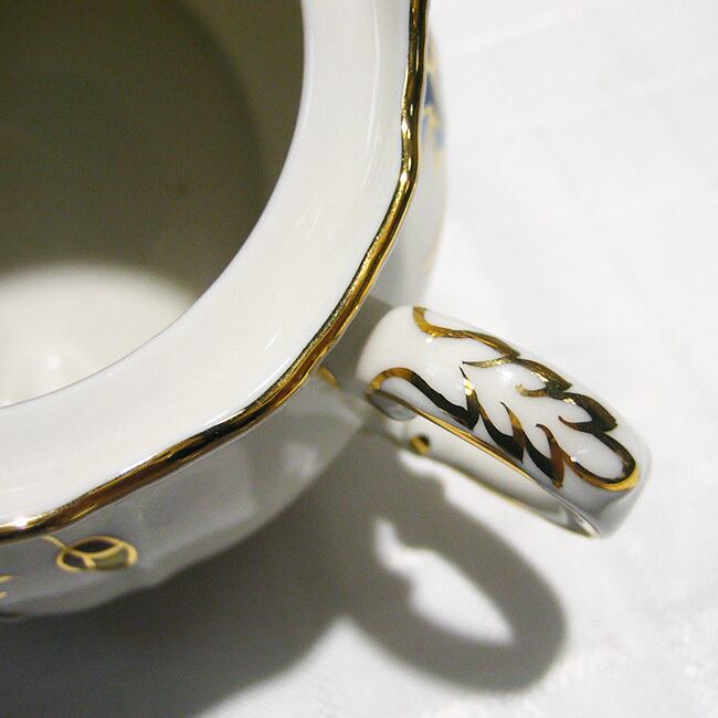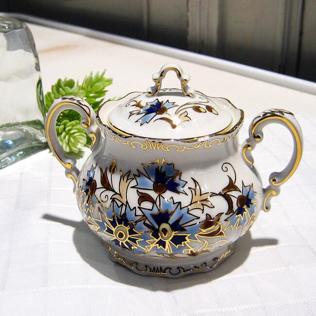 ハンガリーの陶磁器メーカー、ジョルナイ(Zsolnay)の金彩と清楚なブルーのヤグルマギクのデザインがエレガントなモカシュガーポットです。ヤグルマギクの花の青(コーンフラワーブルー)は、ヨーロッパでは青の中で最高に美しいといわれ、自宅に居ながら高級レストランやホテルでお茶を飲んでいるような贅沢な気分が楽しめます。