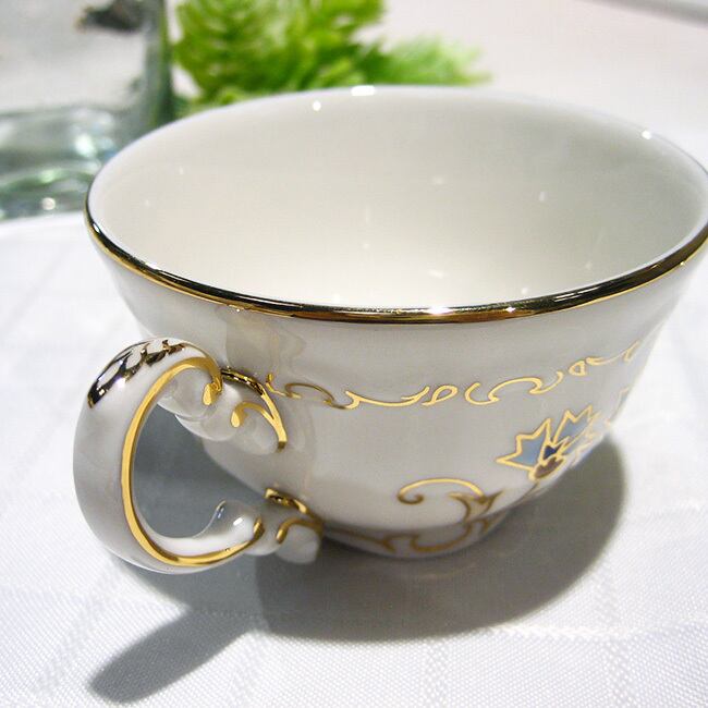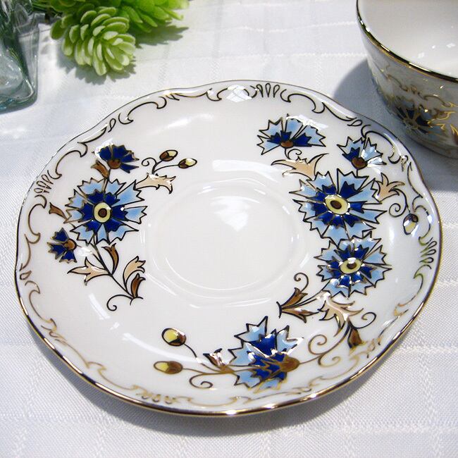 ハンガリーの陶磁器メーカー、ジョルナイ(Zsolnay)の金彩と清楚なブルーのヤグルマギクのデザインがエレガントなモカカップ&ソーサーです。ヤグルマギクの花の青(コーンフラワーブルー)は、ヨーロッパでは青の中で最高に美しいといわれ、自宅に居ながら高級レストランやホテルでお茶を飲んでいるような贅沢な気分が楽しめます。