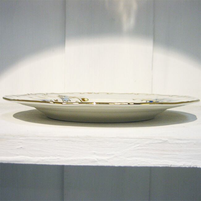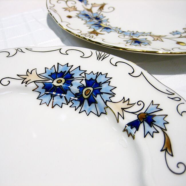ハンガリーの陶磁器メーカー、ジョルナイ(Zsolnay)の金彩と清楚なブルーのヤグルマギクのデザインがエレガントなデザートプレートです。ヤグルマギクの花の青(コーンフラワーブルー)は、ヨーロッパでは青の中で最高に美しいといわれ、自宅に居ながら高級レストランやホテルのような贅沢な気分が楽しめます。
