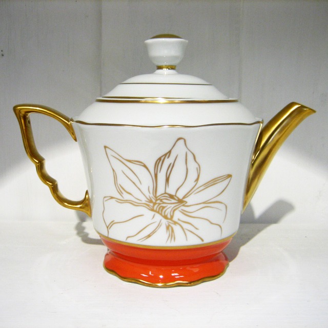 ハンガリーの陶磁器メーカー、ジョルナイ(Zsolnay)の強調された花のモチーフと美しい金彩がリッチなパトリツィア・グッチコレクションのティーポットです。馴染みやすいサーモンオレンジがエレガントで、自宅に居ながら高級レストランやホテルでお茶を飲んでいるような贅沢な気分が楽しめます。